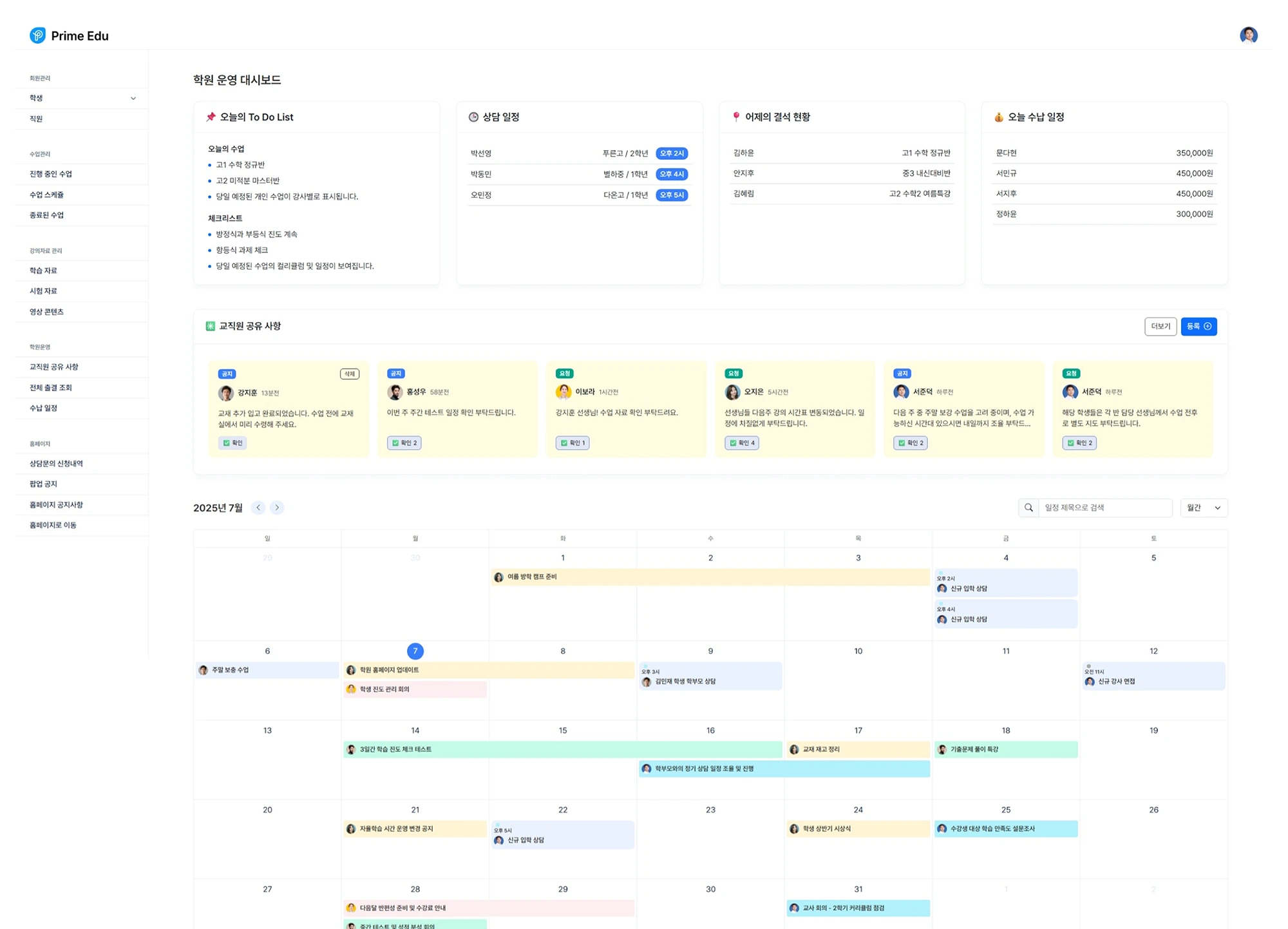 학원 전체 일정과 강사별 개인 스케줄을 쉽게 공유하고 효율적으로 조율