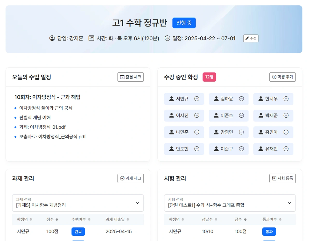 수업별 학생들의 과제 수행 여부와 시험 점수 등을 간편하게 등록하고 조회