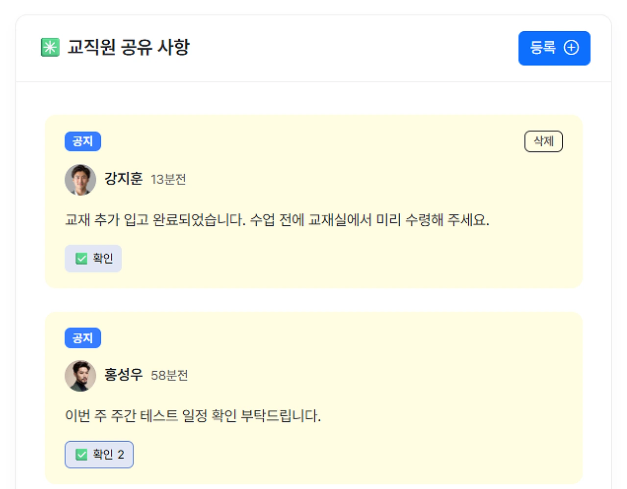 원장, 강사, 직원들이 필요한 공지사항을 신속하게 전달하고 확인